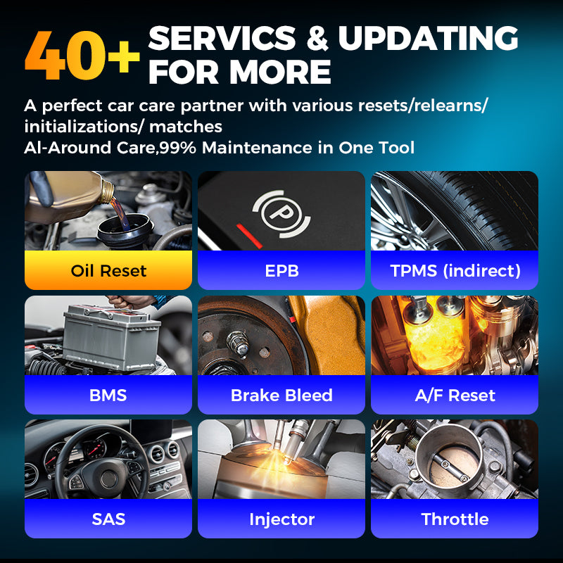 Serve for component reset/match/calibration and 99% of vehicle repair. With Oil Reset, EPB Reset, TPMS Reset, BMS Reset, Brake Bleeding, Injector Coding, SAS Reset, Sunroof, Throttle Matching, WIN DR ROOF, Seat Reset, Aftertreatment, Lang Change, etc.